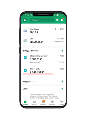 Вся сумма за квартиру находится у вас и лежит на специальном счете, вы можете видеть ее в приложении.